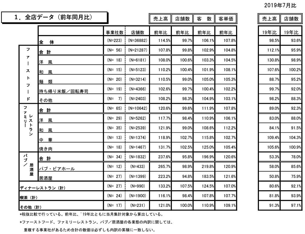全体概況の7月の外食産業の売上げは、営業制限のあった前年を大きく上回り、全体売上げは 114.5%となった。しかし3月の制限解除以降は回復基調にあった店内飲食が、月後半のコロナ第7波の拡大に伴い失速し、業界の全体売上げを押し下げた。