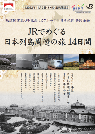 (株)日本旅行(本社東京都中央区、小谷野悦光代表取締役社長)は、JRグループから発表している「鉄道開業150年キャンペーン」を記念する旅行商品として、日本列島をJRの列車を中心に14日間で周遊する特別企画「JRでめぐる日本列島周遊の旅 14日間」を9月1日より発売する。
