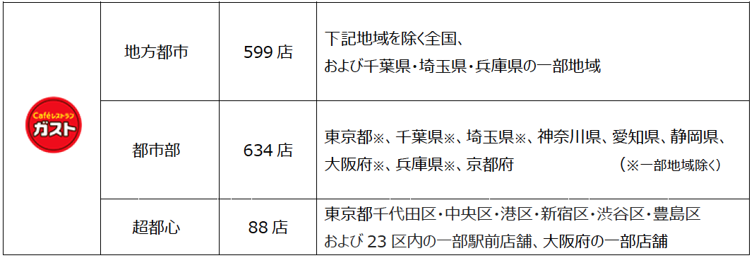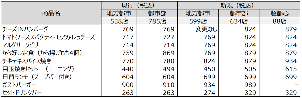 全国展開しているガストでは、その立地特性により地方都市の値上げ幅を抑える一方で、人件費の高騰等により都市部の一部地域(超都心)の価格を変更するなど、3つの地域別価格を導入する。