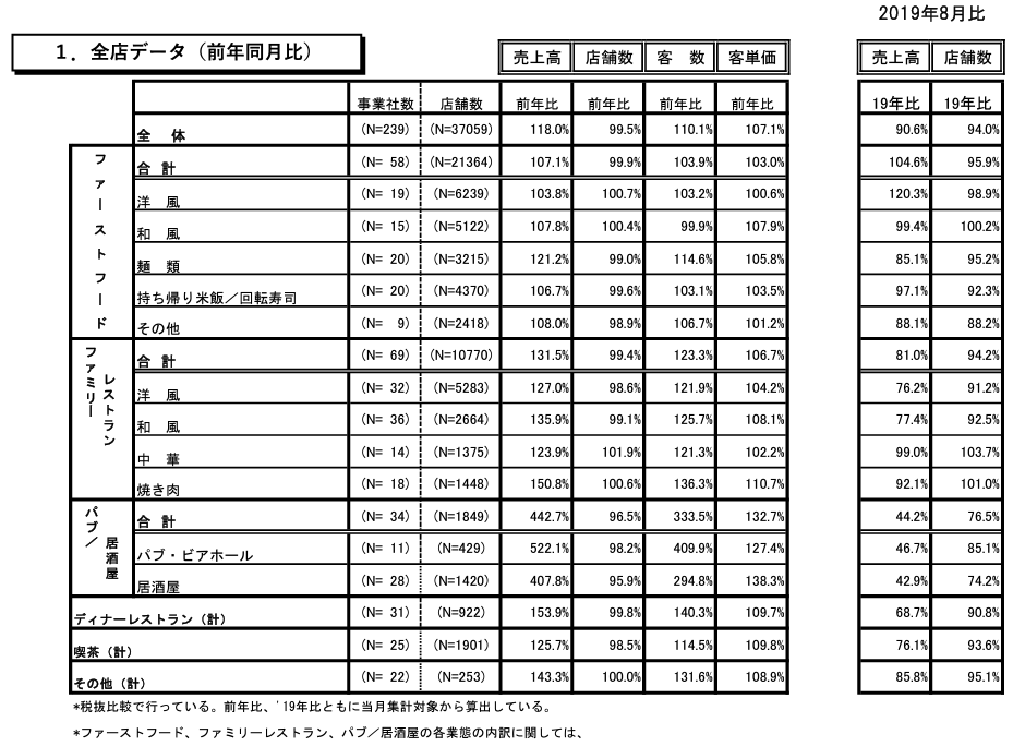 一般社団法人日本フードサービス協会(JF本部:東京都港区、近藤正樹会長)は協会会員社を対象とした外食産業市場動向調査2022年8月度の集計結果をまとめた。「外食産業市場動向調査」は新規店も含めた「全店データ」を業界全体及び業態別に集計し、従来の前年同月比に加えて2019年同月比も算出し掲載している。