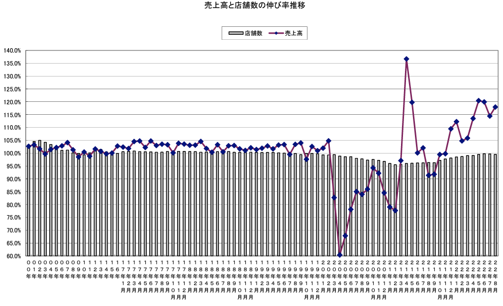 パブ•居酒屋業態は、昨年はコロナ第5波のピークで酒類提供が制限されていたことから、「パブ•居酒屋」の売上げの対前年比は442.7%となっ た。だが新規感染者が拡大した7月後半以降は宴会のキャンセルが続出し、大口の宴会はほぼなくなり小口の宴会もキャンセルが相次いだ。