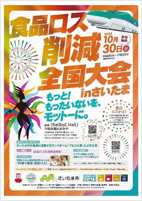 令和4年10月30日(日)に埼玉県さいたま市において、さいたま市及び全国おいしい食べきり運動ネットワーク協議会の主催、消費者庁•農林水産省•環境省共催で令和4年度「食品ロス削減全国大会」開催する。