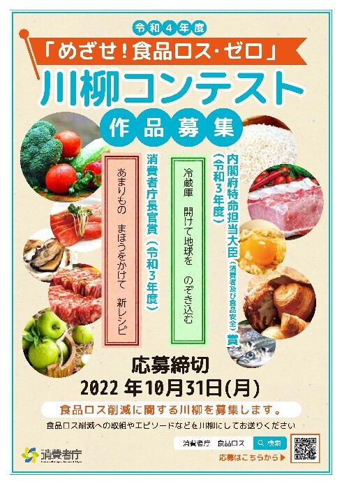 食品ロスの削減について、できることから取り組む機運を醸成すると共に、身近な取組を横展開することにより、国民の皆様それぞれが行動していただけるよう、「令和4年度『めざせ!食品ロス・ゼロ』川柳」として、食品ロス削減をテーマとした川柳を募集し、優れた作品を表彰予定だ。