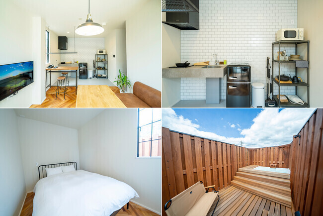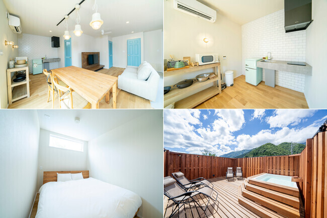 ミドルサイズのお部屋はダブルベッドルーム1つを備え、パートナーとの宿泊にぴったり。キッチンや露天風呂が付いた空間で自宅のようにくつろぐ旅は、いつもとは一味違う体験になるはずだ。