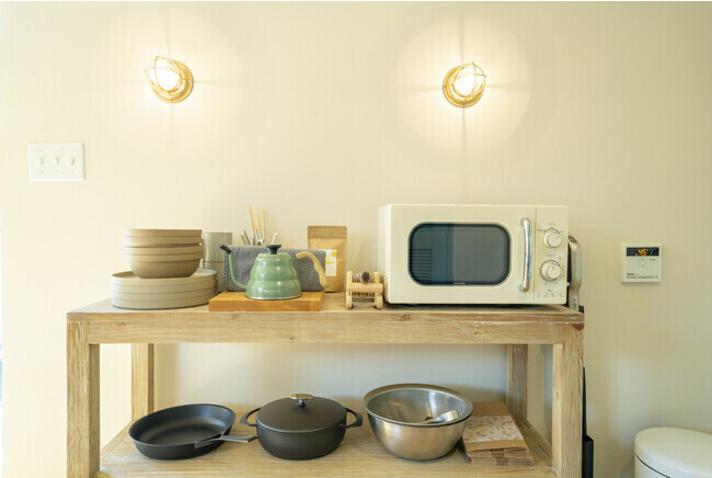 室内には使い捨てアメニティを設置せず、置き型ボトルに統一した。地元産(白馬や信州)やオーガニックにこだわったバス&スキンケアアイテム、伝統的な技術で作られたキッチン用品、白馬の人気カフェ「sounds like cafe」のコーヒードリップバッグや安曇野ハーブスクエアのオリジナルハーブティー等、思わず日常にも持ち帰りたくなるようなアイテムを室内にたくさん詰め込んだ。