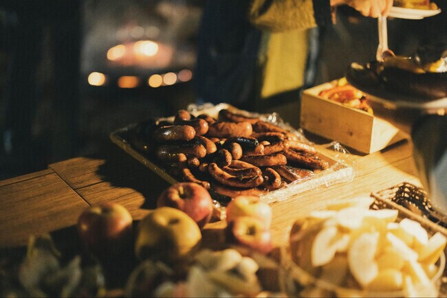 日本アルプスから流れる清流で育った川魚や地元野菜、信州プレミアム牛など地元産の食材をたっぷり使用したBBQメニューをお楽しみいただいた。地元の農家からの旬な野菜、地元の方が作ったジビエ肉のソーセージなど、地産地消にこだわっている。