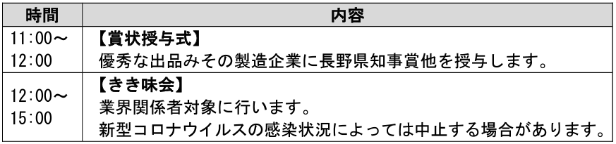 賞状授与式•きき味会は11月8日(火)11:00~15:00、場所は長野県工業技術総合センター食品技術部門 4階講堂で行われる。