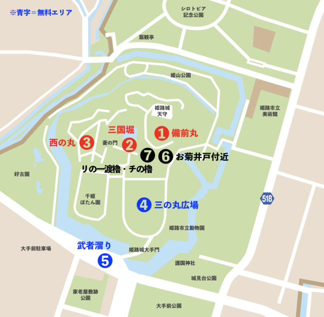 有料エリア内:①備前丸、②三国堀、③西の丸