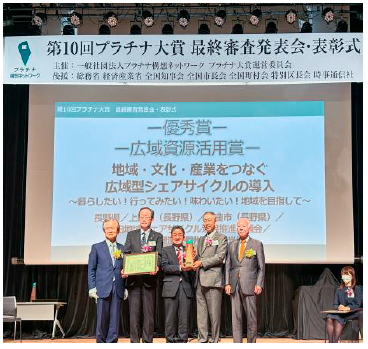 長野県(信州地域デザインセンター:UDC 信州)が上田市、千曲市と進めている「広域シェアサイクル」の取り組みが、10月24日に東京都千代田区で開催された第10回プラチナ大 賞最終審査発表会•表彰式において「優秀賞(広域資源活用賞)」を受賞した。また、この受賞により長野県、上田市、千曲市は「プラチナシティ」に認定された。