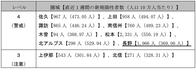 感染の状況等では、長野圏域における直近1週間(10月25日から31日)の新規陽性者数は1,966人(人口10万人当たり369.06人)となっている。この状況は県独自の感染警戒レベルにおいて、圏域のレベルを4に引き上げる目安となる基準(人口10万人当たり300.0人以上)に継続して該当しており、感染が拡大していると認められる。このため、長野圏域の感染警戒レベルを3(注意)から4(警戒)に引き上げる。