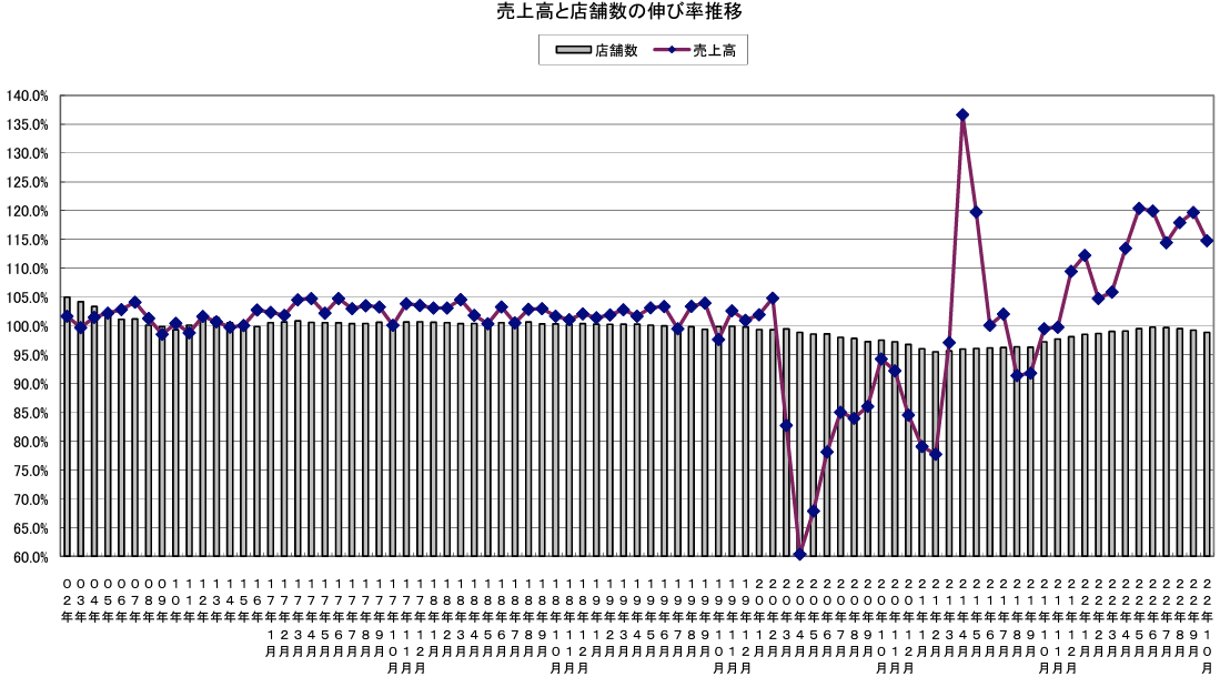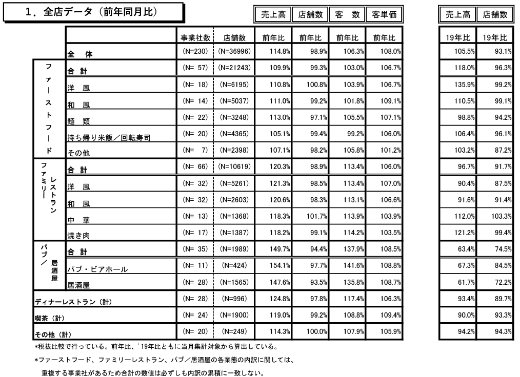 全体概況は10月は11日より「全国旅行支援」や「水際対策の大幅緩和」が始まり、秋の訪れとともに全国で人の流れが活発化し、おおむね店舗数減少の中でも客数増となり、価格改定による客単価増とあいまって、全体売上げは114.8%となった。業態によって差異はあるが、全体では 19年対比で初めてコロナ以前を上回り105.5%になった。しかし新たにインフレとの闘いという難問に直面している。