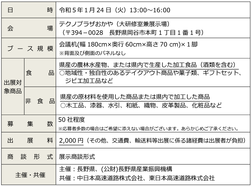 長野県及び(公財)長野県産業振興機構では、県内食品加工企業等の販路拡大と県産品の消費拡大を図るため、県内を中心とした高速道路のサービスエリア、パーキングエリアにおける事業展開を希望する事業者を対象とした商談会を1月24日に開催する。