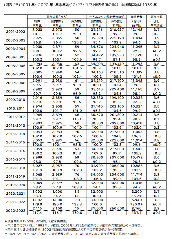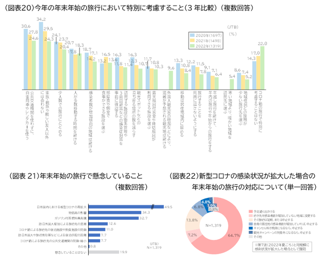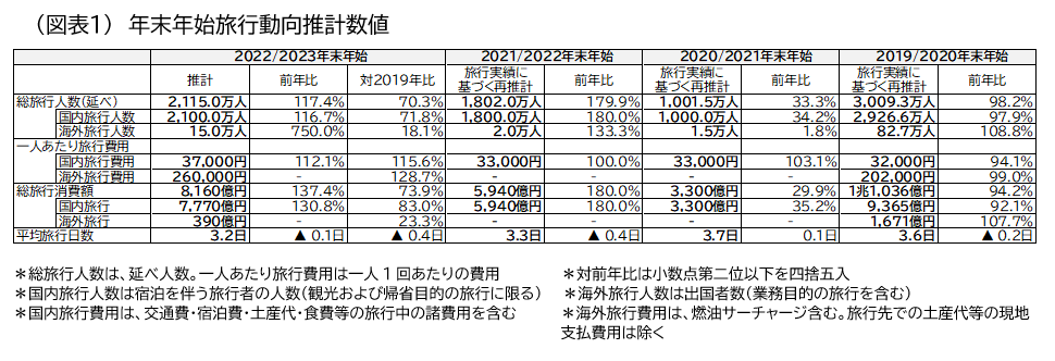 しかしながら、日本国内も円安やエネルギー高による物価上昇が生活に影響を及ぼしつつありまた現在、第8波の新型コロナの感染が拡大し、行動制限の要請はなくとも一定程度の人が旅行を控えるとみられる。全国旅行支援が年内は12月27日で終了する予定でもあることから、旅行全体は本格的回復に向かいつつも、年末年始期間は多少の影響があると予想される。