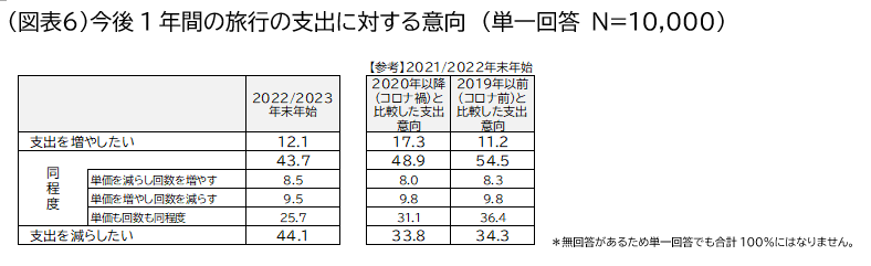 「今後1年間の旅行の支出に対する意向」を聞いたところ、「支出を増やしたい」と回答した人は12.1%で、2021年度調査において、「コロナ禍(2020年以降)より旅行支出を増やしたい」と回答した17.3%から5.2ポイント減少した。「支出を減らしたい(44.1%)」は同調査(33.8%)から10.3ポイント増加した(図表6)。2020年の年末が新型コロナ感染拡大期だったことから、昨年はその反動を受け「旅行日数を増やす」「支出を増やしたい」が大きく増えていたが、今年は落ち着きを取り戻した結果となった。
