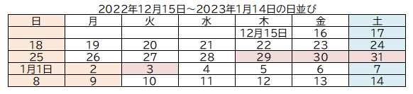 年末年始(2022年12月23日~2023年1月3日)の