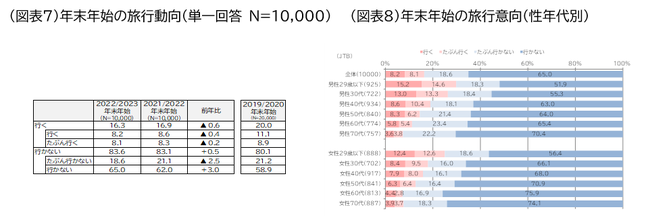 JTBは「年末年始(12月23日~1月3日)に1泊以上の旅行に出かける人」の旅行動向見通しをまとめまた。本レポートは旅行動向アンケート、経済指標、業界動向や予約状況などから推計している。