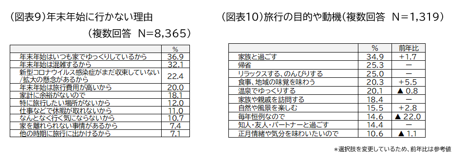 事前調査で「年末年始に国内旅行に行く/たぶん行く」と回答した人のうち1,319人に旅行の目的や動機を聞いた。上位から「家族と過ごす(34.9%)」「帰省(25.3%)」「リラックス、のんびりする(25.0%)」となった(図表10)。