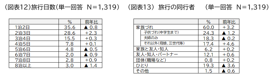 旅行日数:「1泊2日」が35.6%と最も多かったものの、前年より0.8ポイント減少した。「2泊3日(28.6%、前年比+2.3ポイント)」「3泊4日(15.5%、同+0.3ポイント)」「4泊5日(7.8%、同+0.1ポイント)」は増加し、5泊以上は7泊を除き昨年より割合が減少した(図表12)。