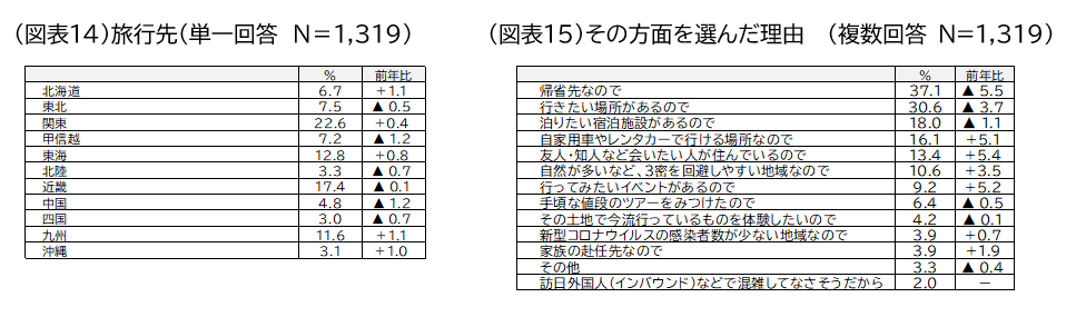 その方面を選んだ理由は「帰省先なので(37.1%)」が最も高くなっが、前年より5.5ポイント減少した。続いて「行きたい場所があるので(30.6%、同▲3.7ポイント)」「泊まりたい宿泊施設があるので(18.0%、同▲1.1ポイント)」と、いずれも昨年より減少した。「自家用車やレンタカーで行ける場所なので(16.1%、同+5.1ポイント)」「自然が多いなど3密を回避しやすい地域なので(10.6%、同+3.5ポイント)」「新型コロナウイルスの感染者数が少ない地域なので(3.9%、同+0.7ポイント)」など、感染症防止策を意識した選択肢が引き続き増加している一方で、「友人•知人など会いたい人が住んでいるので(13.4%、同+5.4ポイント)」「行ってみたいイベントがあるので(9.2%、同+5.2ポイント)」など、個人の興味に関わる項目が増加した(図表15)。