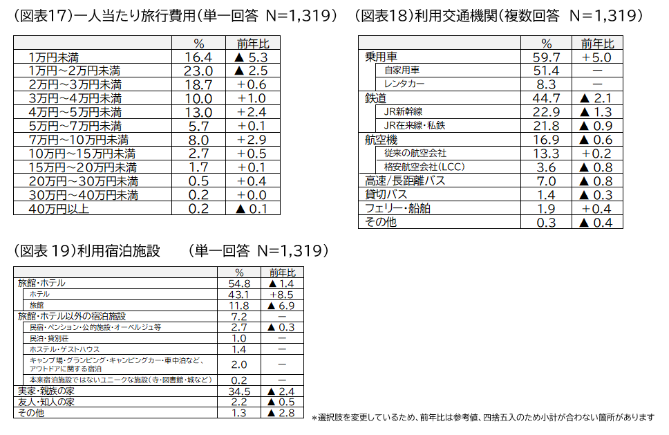 一人当たりの旅行費用:「1万円~2万円未満(23.0%、前年比▲2.5ポイント)」が最も多く、次いで「2万円~3万円未満(18.7%、同+0.6ポイント)」「1万円未満(16.4%、同▲5.3ポイント)」となった。2万円未満は7.8ポイント減少した一方で、2万円以上は「40万円以上(0.2%、同▲0.1ポイント)」を除くすべての項目で増加し、特に「4万円~5万円未満」「7万円~10万円未満」で高い増加率となった(図表17)。