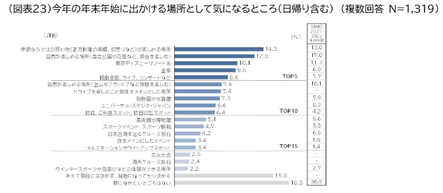 今年の年末年始に旅行や日帰りで出かける場所として、どのような所が気になっているか聞いてみた。「季節ならではの買い物が楽しめる場所(14.3%)」が最も高く、次いで「自然が楽しめる場所(国立公園や花畑など景観を楽しむ)(12.8%)」、「東京ディズニーリゾート®(10.1%)」となった(図表23)。