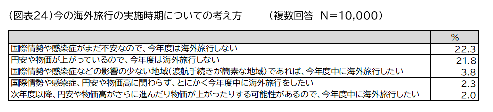 今の海外旅行の実施時期についての考え方で最も多かったのが、「国際情勢や感染症がまだ不安なので、今年度は旅行しない(22.3%)」、続いて「円安や物価が上がっているので、今年度は旅行しない(21.8%)」となり、消極的な意見が上位となった(図表24)。