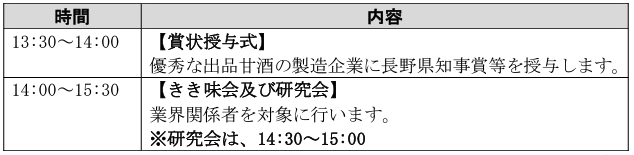 長野県では、県産甘酒の品質向上と技術の研さんを目的として、長野県酒造組合及び長野県味噌工業協同組合連合会と共催で、12月2日(金)に甘酒鑑評会審査会を開催し、県知事賞ほか各賞を決定した。ついては12月13日(火)に「賞状授与式」「きき味会」及び「研究会」を行う。