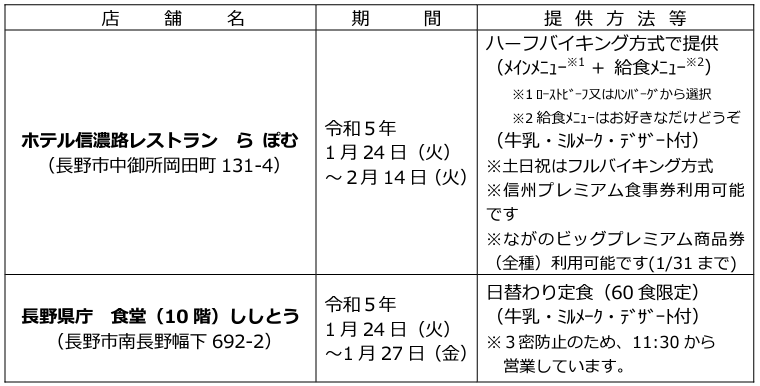 全国学校給食週間(毎年1月24日から1月30日)に合わせ、昔懐かしい給食メニューや現在学校給食で提供されている人気メニューを下記の飲食店で提供する。各学校では「学校給食」を通じて適切な栄養の摂取や望ましい食習慣などを学ぶ「食育」を行っている。「この機会に是非ご賞味下さい」と述べている。