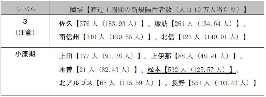 感染の状況等で、松本圏域における直近1週間(2月17日~23日)の新規陽性者数は、532人(人口10万人当たり125.57人)と、県独自の感染警戒レベルにおいて、レベル3の目安となる基準(人口 10万人当たり150.0人以上)を下回っており、感染拡大のリスクが低下したと認められる。このため、松本圏域の感染警戒レベルを3(注意)から小康期に引き下げる。