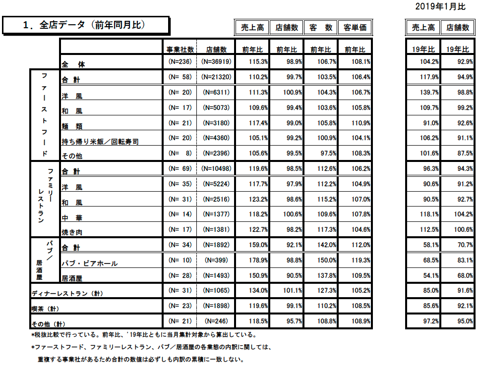 一般社団法人 日本フードサービス協会(東京都港区、近藤正樹会長)は協会会員社を対象とした外食産業市場動向調査 2023年1月度の集計結果をまとめた。「外食産業市場動向調査」は新規店も含めた「全店データ」を業界全体及び業態別に集計し、従来の前年同月比に加えて2019年同月比も算出し掲載している。