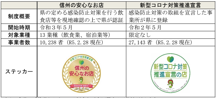 新型コロナウイルスの感染症法上の位置づけが5類感染症に変更されることを受け、「信州の安心なお店」認証制度及び「新型コロナ対策推進宣言」を5月7日をもって終了する。