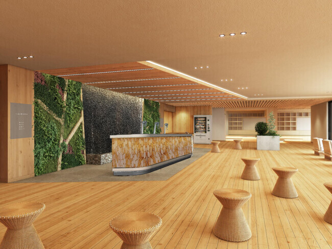 湯上がり処では、木目と間接照明のぬくもりあふれる空間に滝の水音が流れ、さらなる寛ぎがお待ちしている。蓼科山の天然伏流水•伏流炭酸水をフリーでお楽しみいただけるほか、伏流水を使った珈琲•紅茶等のドリンクを用意。待合も有意義にお過ごしいただける。