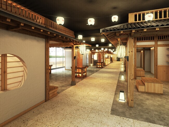 ・新築した新本館には、ロビーフロント•レストラン•大浴場•土産処や屋台などパブリックスペー