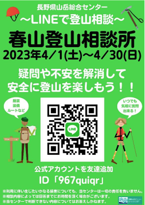 春山(残雪期)ならではのリスクについて正しく理解いただき、安全に登山を楽しんでいただくため、特に新たに登山を始める方や数年越しに登山を再開する方は積極的にご活用下さいと話している。期間は4月1日(土)~4月30日(日)となっている。相談内容は主に登山初心者を対象とした山岳相談を行う。(例)春山の登山装備、登山道の状況、 天気の調べ方、トラブルへの対応方法、その他登山に関する疑問などだ。