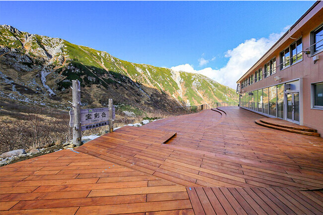 「日本一空に近いテラス」として、千畳敷カールと宝剣岳を一望でき、さらに間近で中央アルプスの大自然を体感できるテラスを新設した。曲線を採用した木製テラスにしたことで過ごしやすさ・景観との調和を生み出し、より快適で上質な空間を提供する。