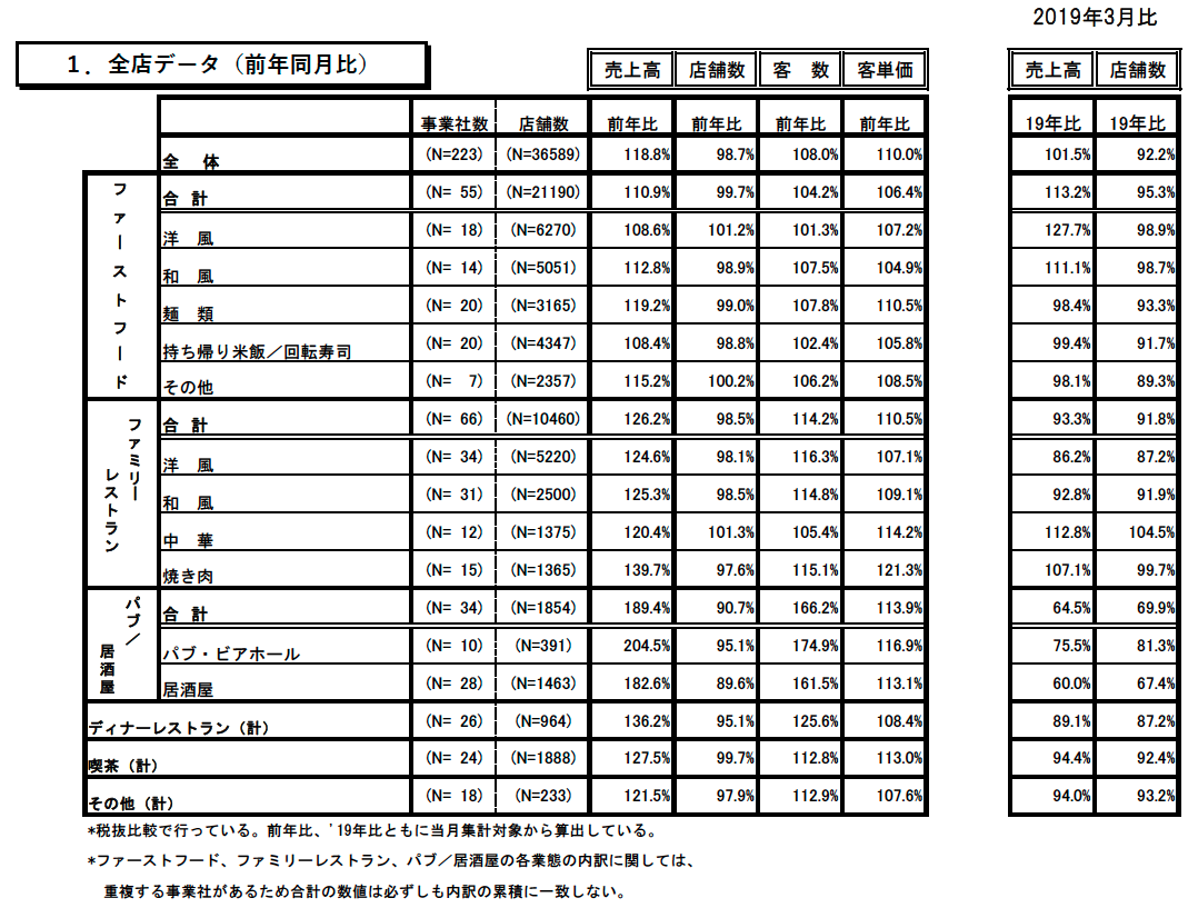 一般社団法人日本フードサービス協会(略称JF 東京都港区、近藤正樹会長)は、協会会員社を対象とした外食産業市場動向調査2023年3月度の集計結果をまとめた。「外食産業市場動向調査」は新規店も含めた「全店データ」を業界全体及び業態別に集計し、従来の前年同月比に加えて 2019年同月比も算出し掲載している。