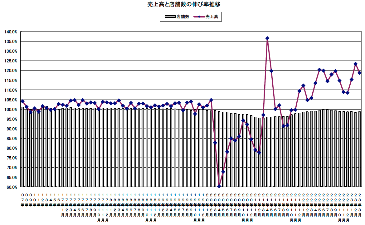 「麺類」も値上がり基調が消費者に浸透し売上げ119.2%となった。「持ち帰り米飯/回転寿司」は、年度の変わり目の歓送迎やWBC観戦などでテイクアウト需要が増え、売上げ108.4%となった。「その他」は人流の回復とともに「アイスクリーム」が引き続き再来店を促すクーポンを配布するなどで客数が増加、売上げ115.2%となった。