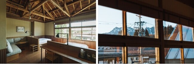 装飾性を極力廃し、もともとの木造建築の美しさを引き出し、空気感や間を大切にすることで戸隠の自然や自身、大切な人と向き合えるミニマルな空間に。レストランと客室には、戸隠山や鏡池をモチーフにした素朴なアートを飾り、客室からは参道のまちなみと荘厳な山々を見晴らすことができる。
