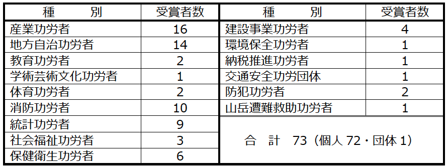 各分野において顕著な功績をあげられた方々を、県表彰規則に基づき以下のとおり表彰する。<表彰種別受賞者数>