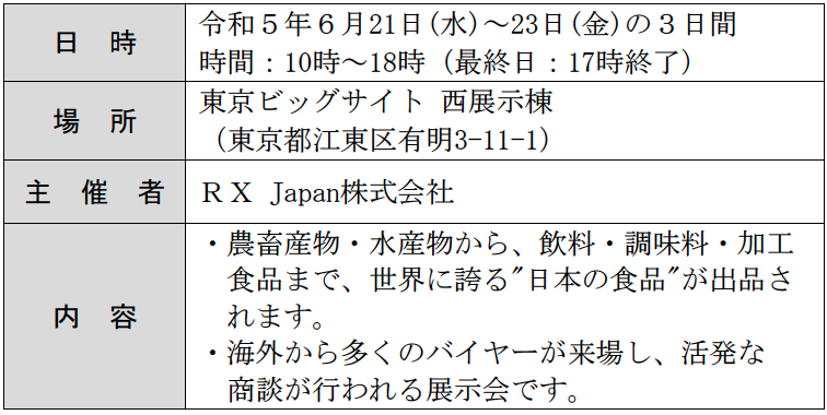 ”輸出EXPO 東京の内容は、農畜産物•水産物から、飲料•調味料•加工食品まで世界に誇る"日本の食品"が出品される。海外から多くのバイヤーが来場し、活発な商談が行われる展示会となっている。