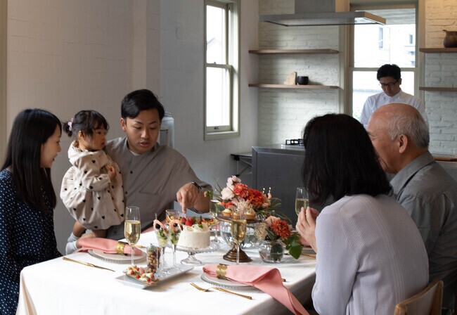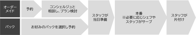 フードデリバリーサービスとは一線を画し、食事を楽しむ空間全体の演出や装飾、高級感のあるカトラリー類のレンタル、プロフェッショナルのシェフやサービススタッフによるライブ感のあるおもてなしなど、これまで外食でしか味わえなかった「非日常的な食事体験」を自宅やマンション内のパーティールームをはじめ、別荘のような旅先においても、お好みの場所で楽しんでいただける。