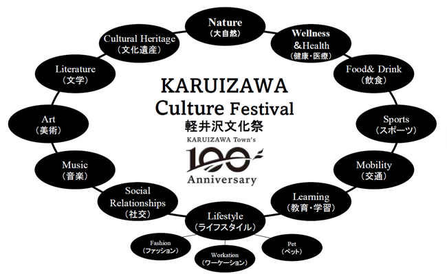 この度、軽井沢町町政100周年を機に「軽井沢文化祭(KARUIZAWA Culture Festival)」を開催する運びとなった。軽井沢の団体•企業が一つの共同体【軽井沢文化祭実行委員会】を発足し、12の文化をテーマに、イベントやワークショップなどの体験機会の場を設けていく予定だ。軽井沢の5つのエリア(中軽井沢、旧軽井沢、新軽井沢、南軽井沢、追分)で、9月16日(土)~ 10月1日(日)までの2週間の開催を予定している。