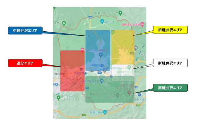 5エリア:「中軽井沢」 「旧軽井沢」 「新軽井沢」 「南軽井沢」 「追分」