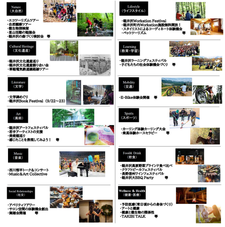 軽井沢町内全域を活用しながら、以下の12の文化テーマにおけるワークショップなどの体験機会の場を設けていく予定。