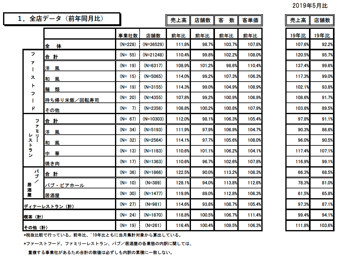 一般社団法人日本フードサービス協会(JF=ジェフ 本部東京都港区、近藤正樹会長)は協会会員社を対象とした外食産業市場動向調査2023年5月度の集計結果をまとめた。「外食産業市場動向調査」は新規店も含めた「全店データ」を業界全体及び業態別に集計し、従来の前年同月比に加えて2019年同月比も算出し掲載している。
