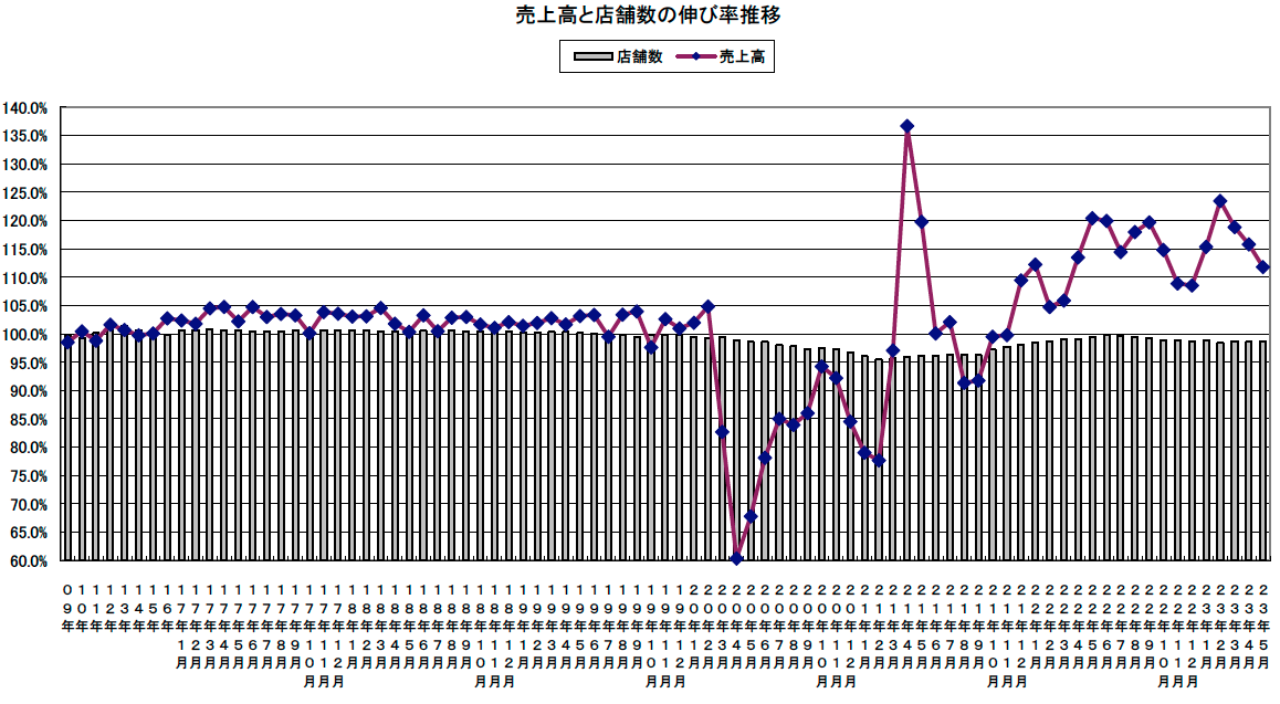 「和風」はコロナの5類移行でビルイン店舗の店内飲食が持ち直し、売上げ114.0%。「麺類」もGWに商業施設立地店舗の集客好調などもあり、売上げは114.3%となった。「持ち帰り米飯/ 回転寿司」は、回転寿司がGWの堅調に加え、都心部でインバウンド需要が好調、売上げ107.8%。「その他」は 「アイスクリーム」がファミリー需要を狙った大容量容器の販売キャンペーンを実施、売上げは108.8%となった。