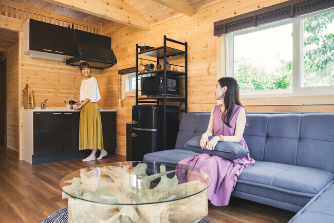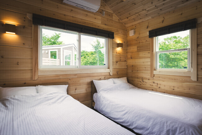 プライベートデッキ3m×7mの広々寛げる設計で、絶景ロケーションを眺めながらバーベキューも楽しめる。室内はゆったりできるリビングと寝室にはアメリカの大手寝具メーカーシモンズ社製のセミダブルベッドが2台並び快適にお休みいただける他、お手洗い、お風呂、洗面台、キッチン、エアコンを完備。長期滞在もできるように備品も各種揃えている。定員は4名(最大6名まで可)で1部屋限定のゆったり過ごせる広いタイプのお部屋だ。