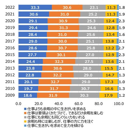 ・仕事(勉強や家事を含む)と余暇のどちらを重視するかを尋ねたところ、63.9%が余暇を重視する傾向にあった。特に「仕事よりも余暇の中に生きがいを求める」の回答率が2020年以降増加している。