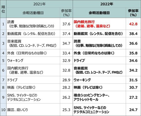 ・余暇活動の参加率は「国内観光旅行(避暑、避寒、温泉など)」が、前年(2021年)から10ポイント上昇して42.8%となり、2019年以来の1位となった。しかし、コロナ禍前の2019年の参加率の水準(54.3%)には戻っていない。