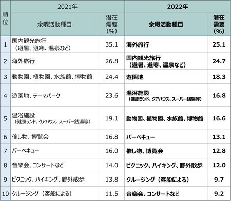 ・各種目の希望率と参加率の差を「潜在需要」として算出したところ、前年(2021年)1位の「国内観光旅行(避暑、避寒、温泉など)」の潜在需要は、参加率の上昇に伴って減少し、2位となった。一方で、「海外旅行」は潜在需要の減少幅が「国内観光旅行」と比べて小さいため1位となった。